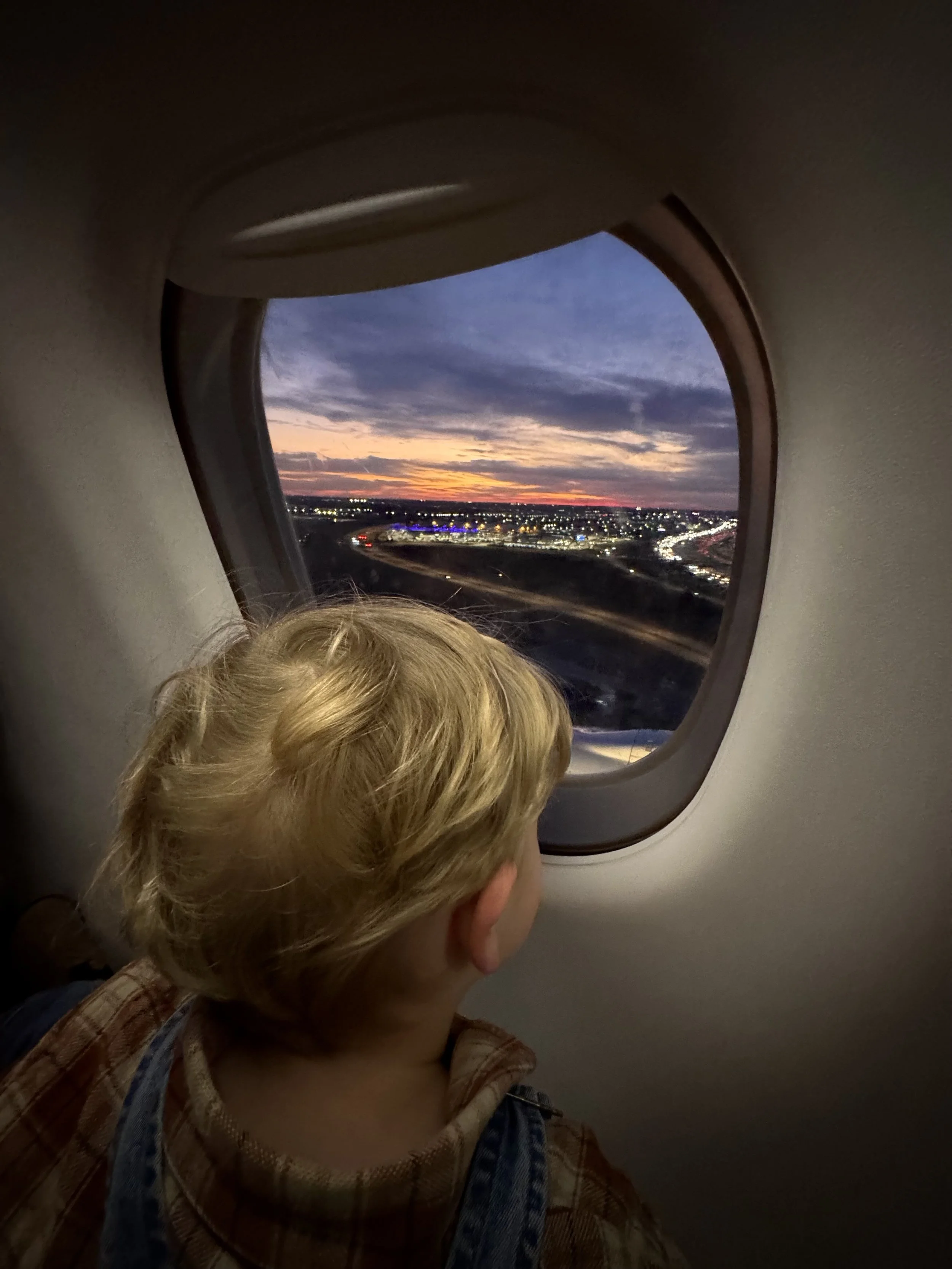 Lucas sits on my lap, face glued to the little pane of glass where the world flies by. His little Blundstone boots match mine. I smile at that. Ezra stands teetering on Mommy’s lap across the aisle, peering out his own window. The rest of the plane has gone quiet, like it gets just before landing. Just the whirr of the engines muscling us through the air as we get ever closer to runway 35L.