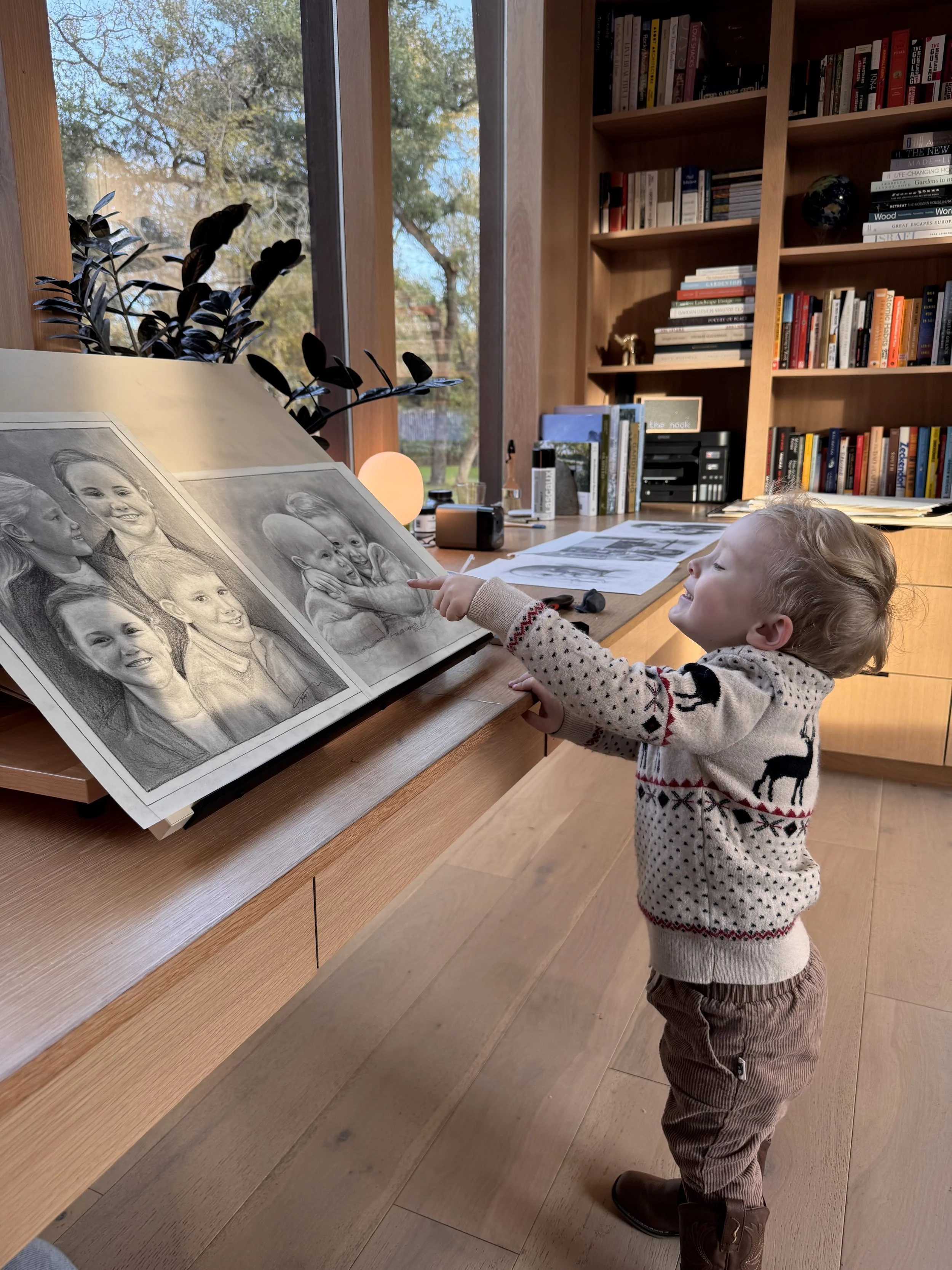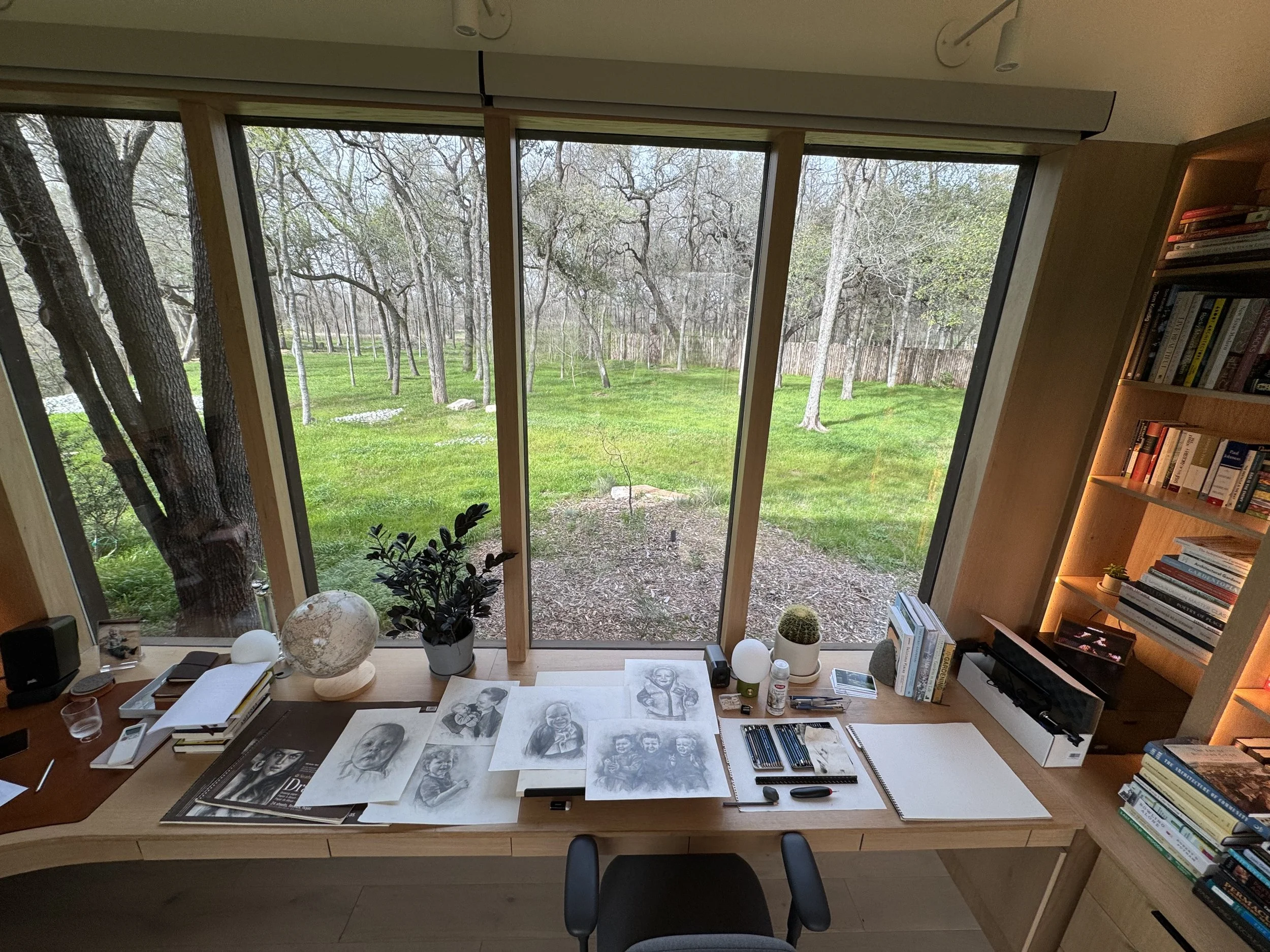 As I told you last week, I’ve drawn around two dozen portraits this year. I’ve created each one at the long white oak desk in the nook, pushed right up against a wall of glass. When I draw, I’m surrounded by live oaks, green grass and birds moving through the frame all day long.