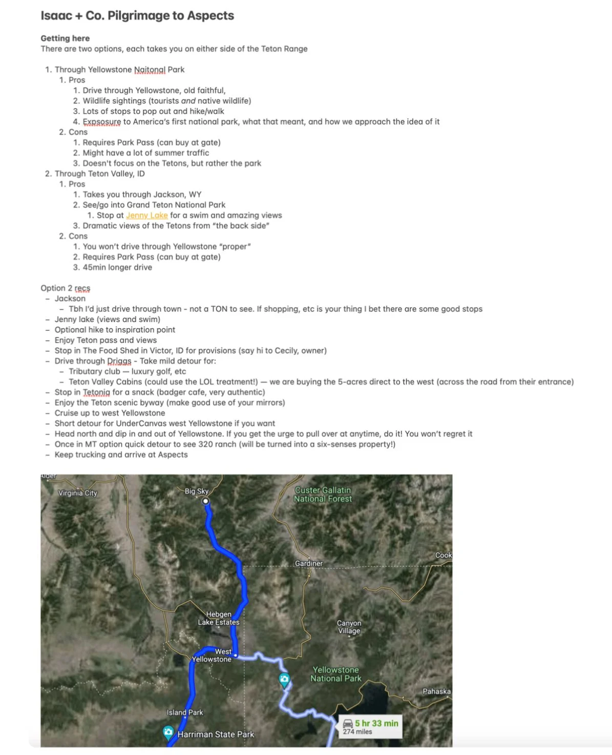 A few hours later, he sent over a shared note. I opened it to find a stunningly detailed list of thoughtful recommendations of places to see, back roads to take, and spots to eat at. It was magical.