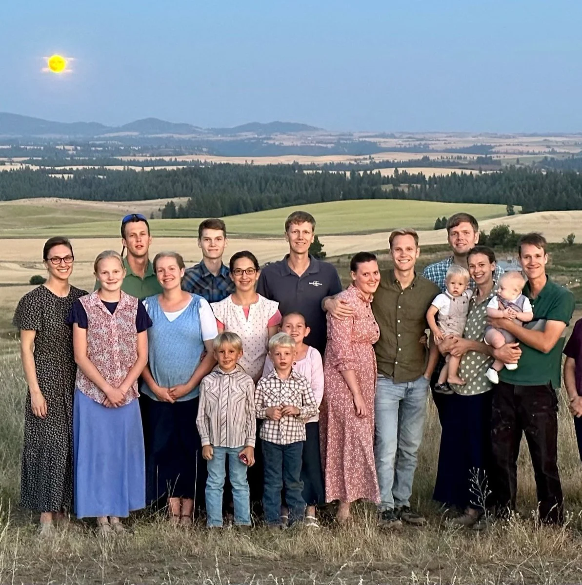 I found a photo of some of us siblings and friends after a family dinner in the barn. We climbed the hill for sunset. Then a harvest moon rose over Morning Glory Farm.